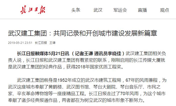長江日報融媒體5月21日訊 (記者王謙 通訊員李曉佳)武漢建工集團相關負責人說,長江日報和武漢建工集團有著緊密的聯(lián)系,剛剛啟用的長江傳媒大廈就是武漢建工集團的經典作品,獲得2018年國家優(yōu)質工程獎。