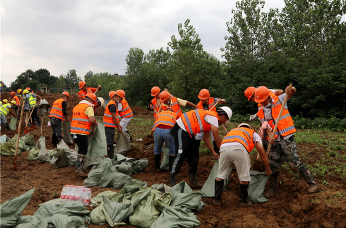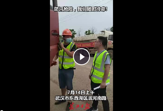 武漢建工集團防汛搶險第一分隊的260多位隊員與數(shù)十臺搶險車輛及機械設備,在武漢市東西湖區(qū)濱河南路集結待命。